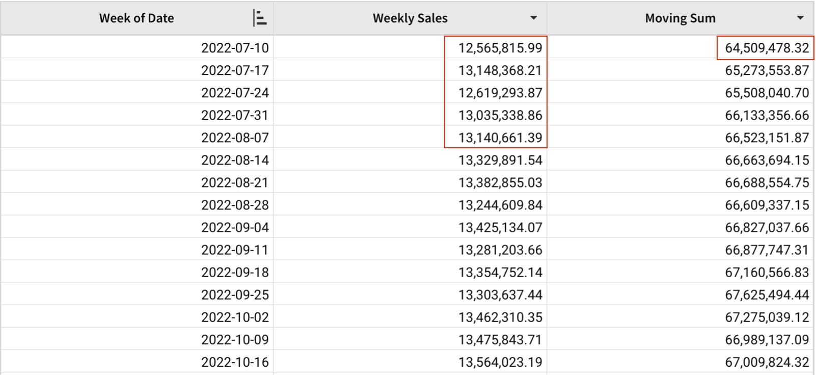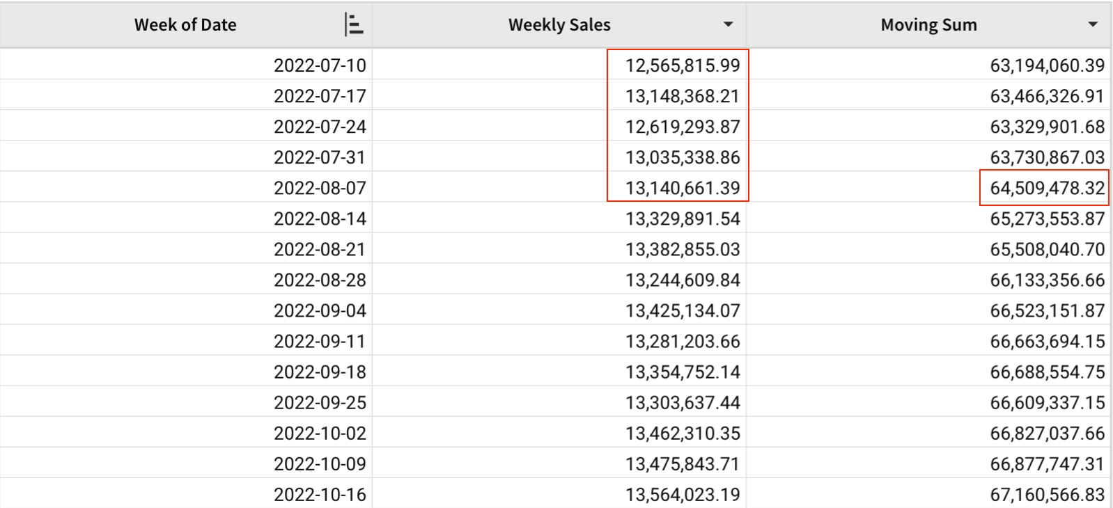 Here, the above argument is 0, so there will not be any previous weeks included in the sum calculation. The below average is 4, so the sum of weekly sales will be computed for each week along with the next 4 weeks.