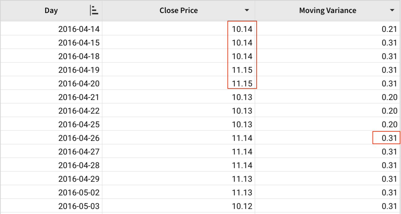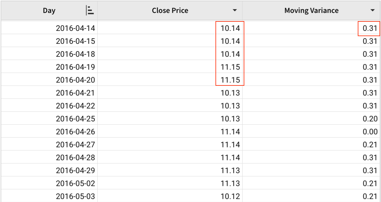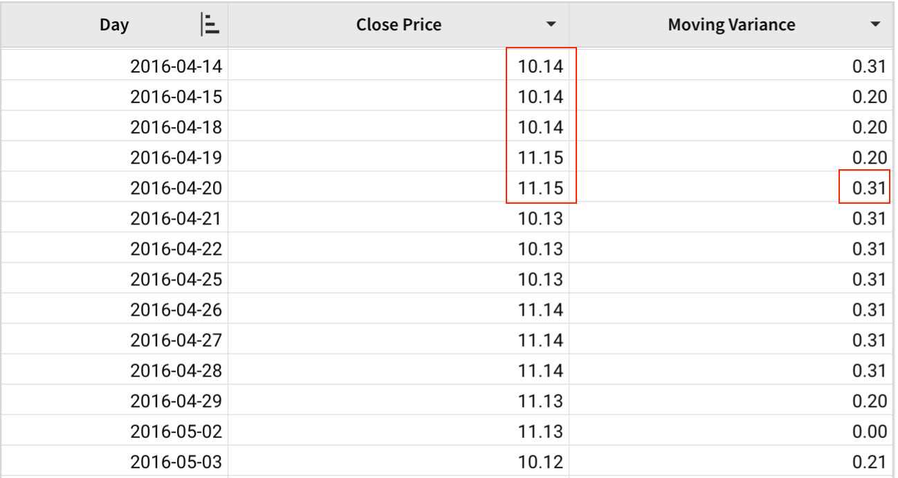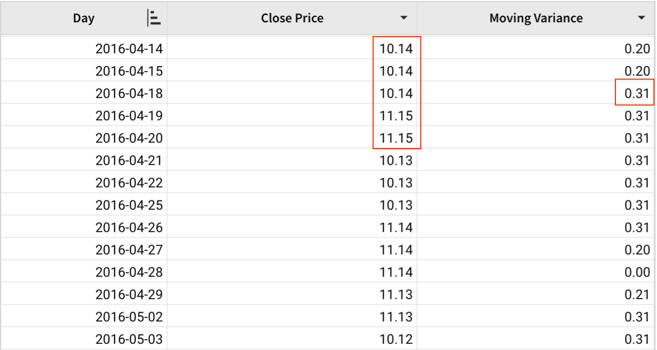 A table contains the daily close price of a stock in 2016. Variance can be used to show the volatility of a stock, where a higher variance indicates higher risk. We can use the MovingVariance function to identify the change in variance in different moving windows.