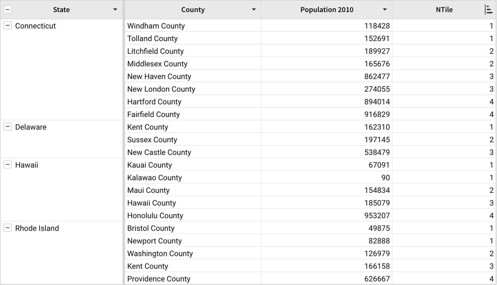column. Using the Ntile function, an equal number of rows will be ranked 1, 2, 3 and 4 according to the size of the [Population 2010]