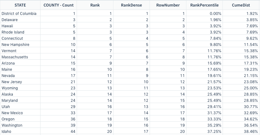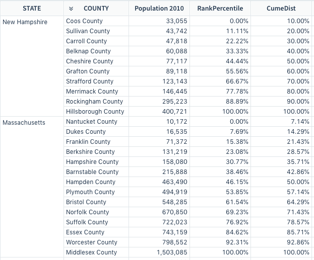 ๐The percentile is a number between 0 and 1. The last row is always 1 and the first is 0, unless there is only 1 row or there is a tie for the top value. To display the result as percentages as opposed to numbers, change the column formatting from Automatic to Percent.