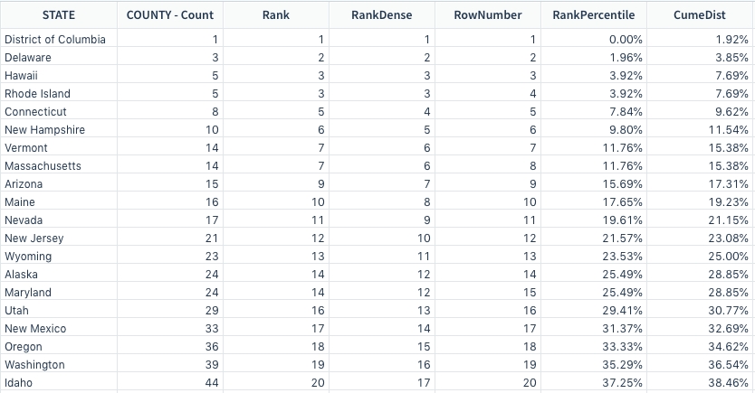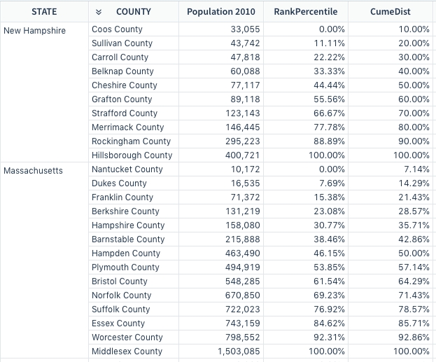 📘The percentile is a number between 0 and 1. The last row is always 1 and the first is 0, unless there is only 1 row or there is a tie for the top value. To display the result as percentages as opposed to numbers, change the column formatting from Automatic to Percent.