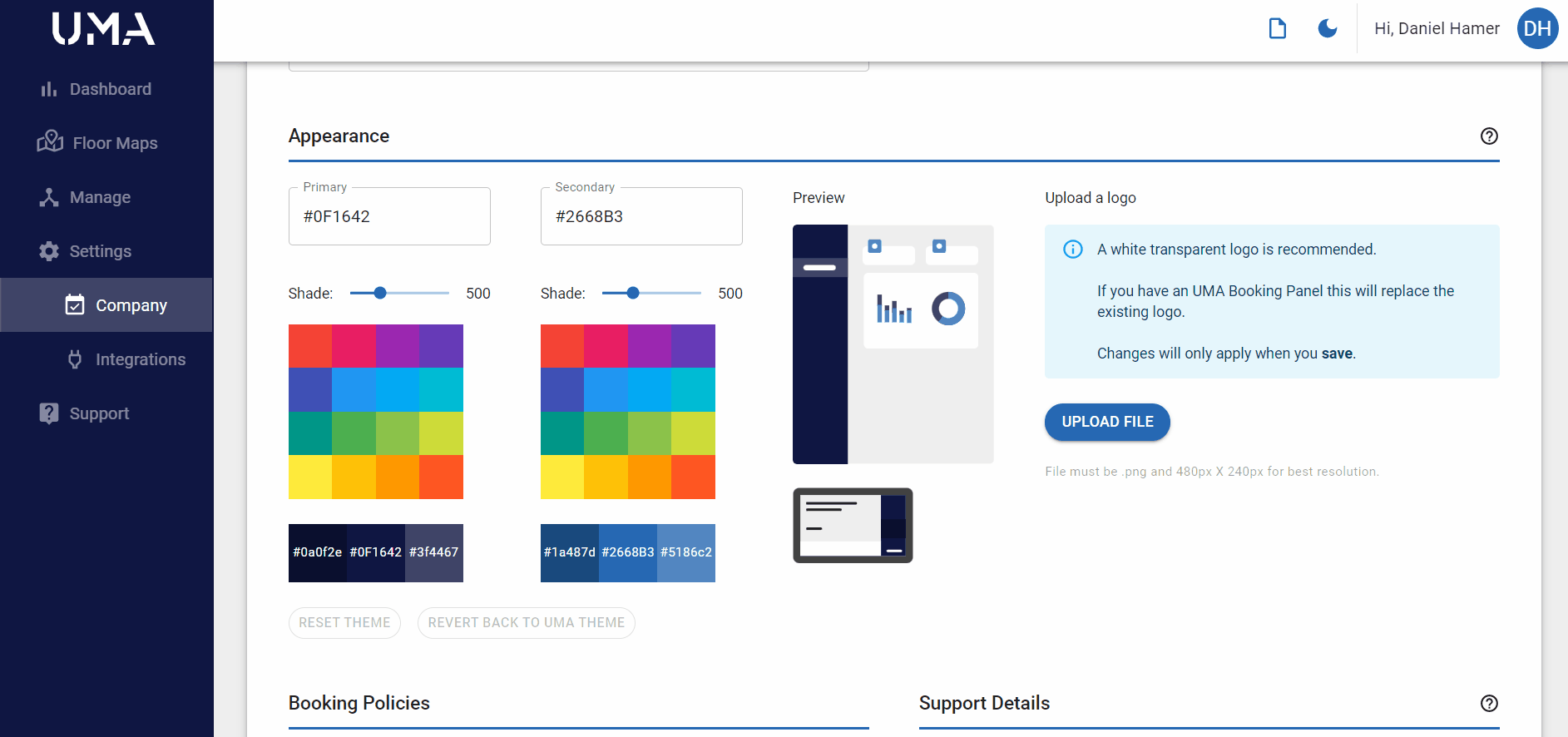 With this latest update you are now able to change the appearance of the UMA web portal within your Company Settings.