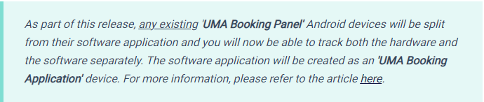 As part of this release, the Android booking panel application has been converted to the UMA Booking Application as well. This application type covers both the Web and Android version.