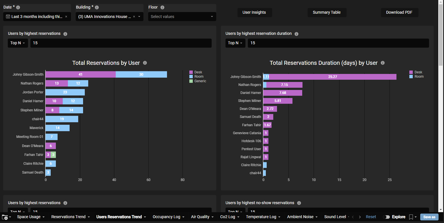 Understand how your team utilises resources with tailored charts showcasing individual reservation trends, no-shows, and out-of-hours usage.