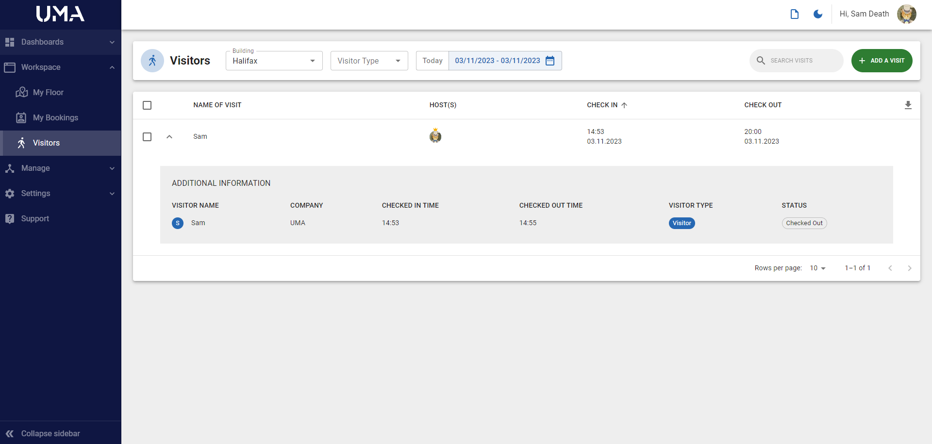 Furthermore, you have the option to switch between buildings and select a date range to customise your view of visits. This allows you to filter between visitors and ad hoc employee check-ins.