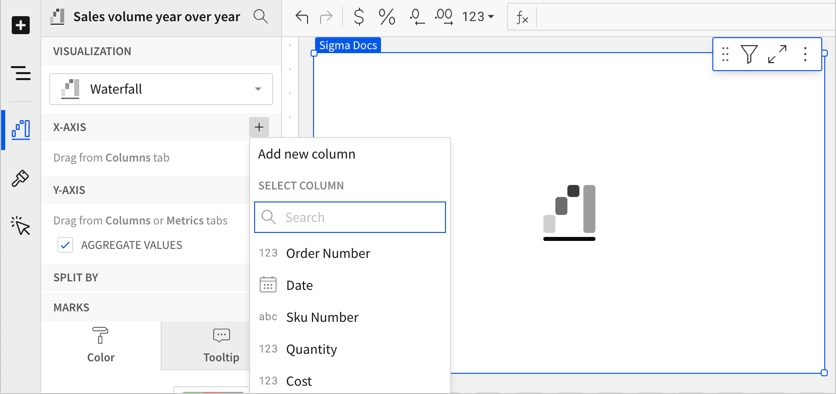 [optional] Repeat the previous steps to add additional y-axis source columns and create a stacked waterfall chart.