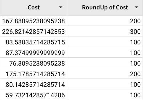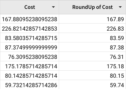 Rounds the value for each row in the input column up. Numbers are rounded by 2 digits.